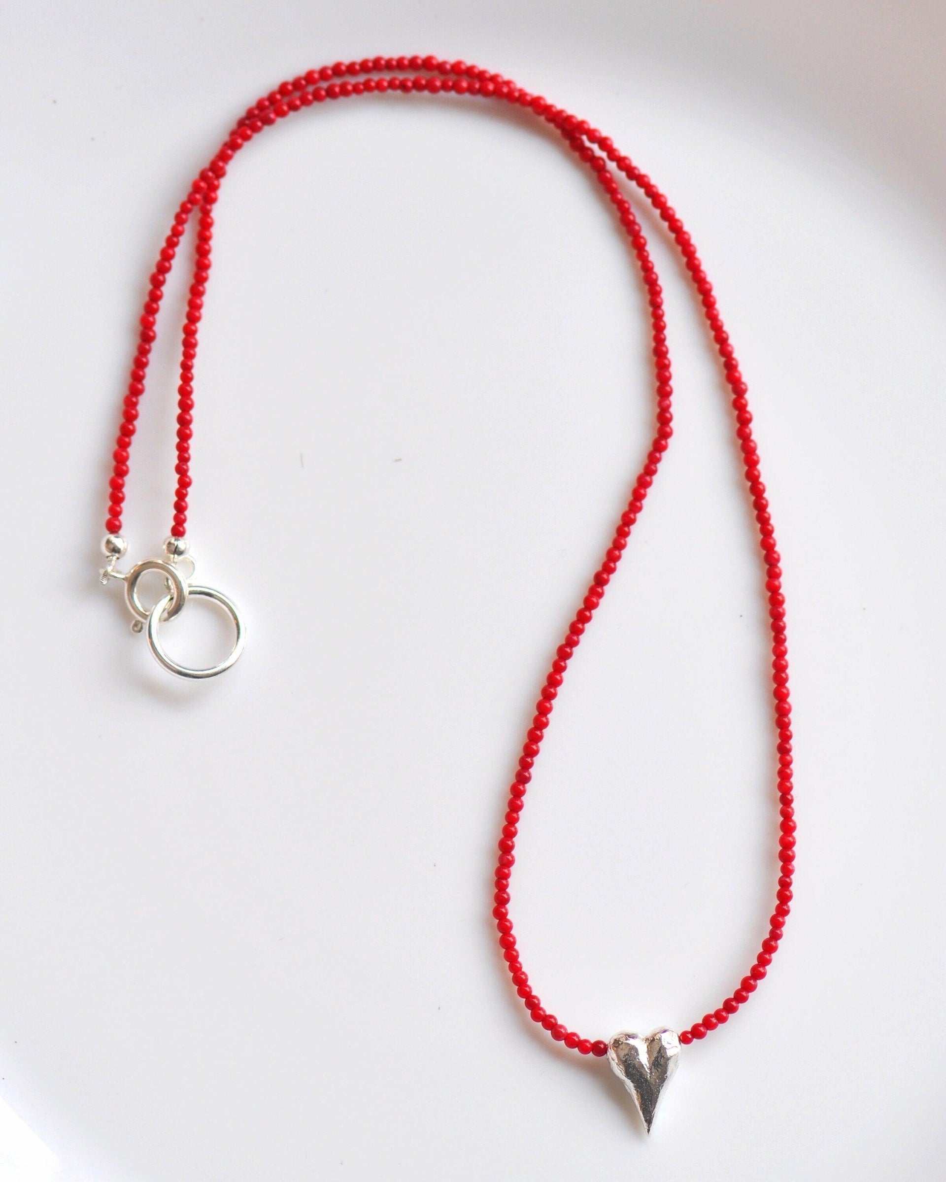 The contrasting hues of the red coral beads and silver heart charm create a beautiful visual appeal that is both bold and delicate. The sculptural design of the heart charm adds a touch of charm and character to the necklace, making it a versatile accessory that can be worn with a wide range of outfits.