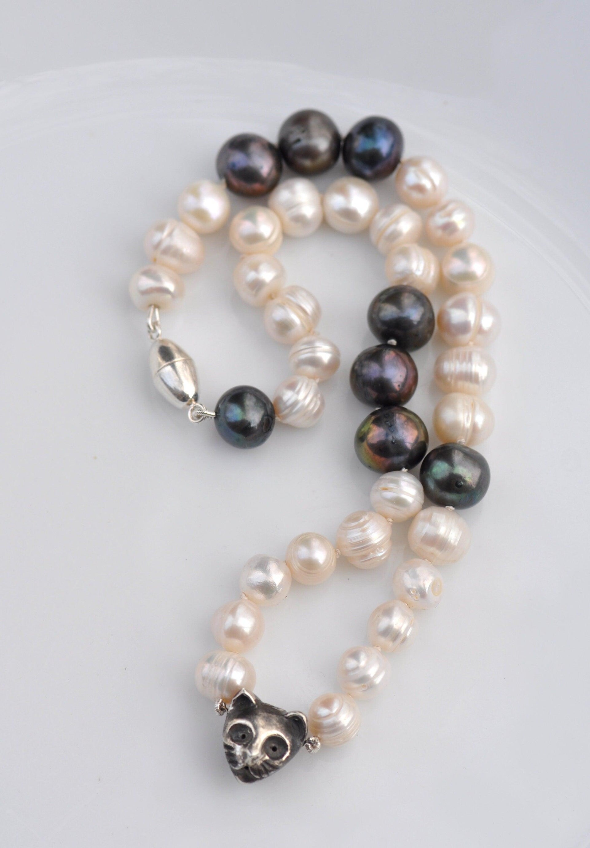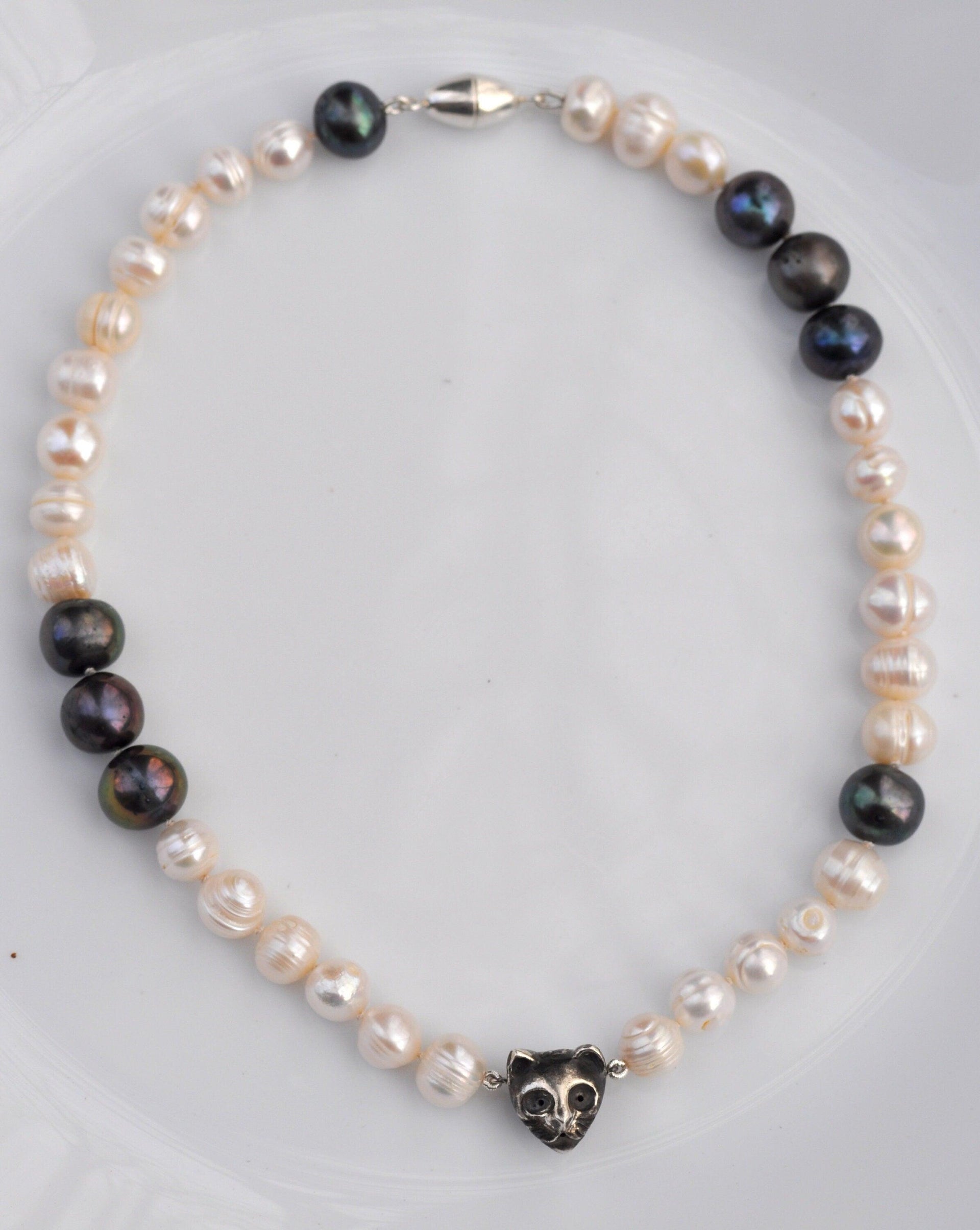 Add a touch of feline chic to your jewelry collection with our unique Black & White Freshwater Pearl Necklace featuring a stunning silver cat charm.