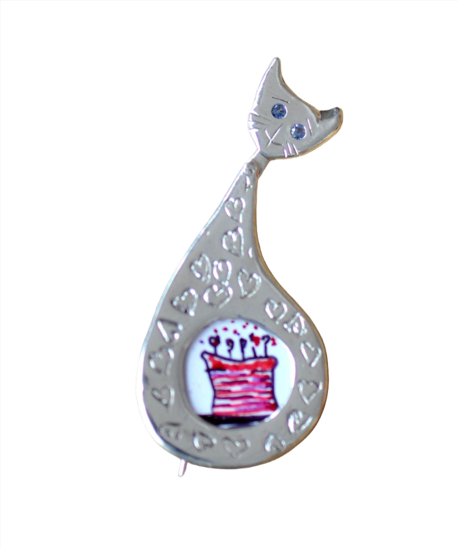 But this brooch isn't just a beautiful accessory - it also serves as a customizable photo frame. Swap out the intricate cake drawing with your favorite photo or image, making it a versatile piece that can hold cherished memories or showcase your beloved feline friend.