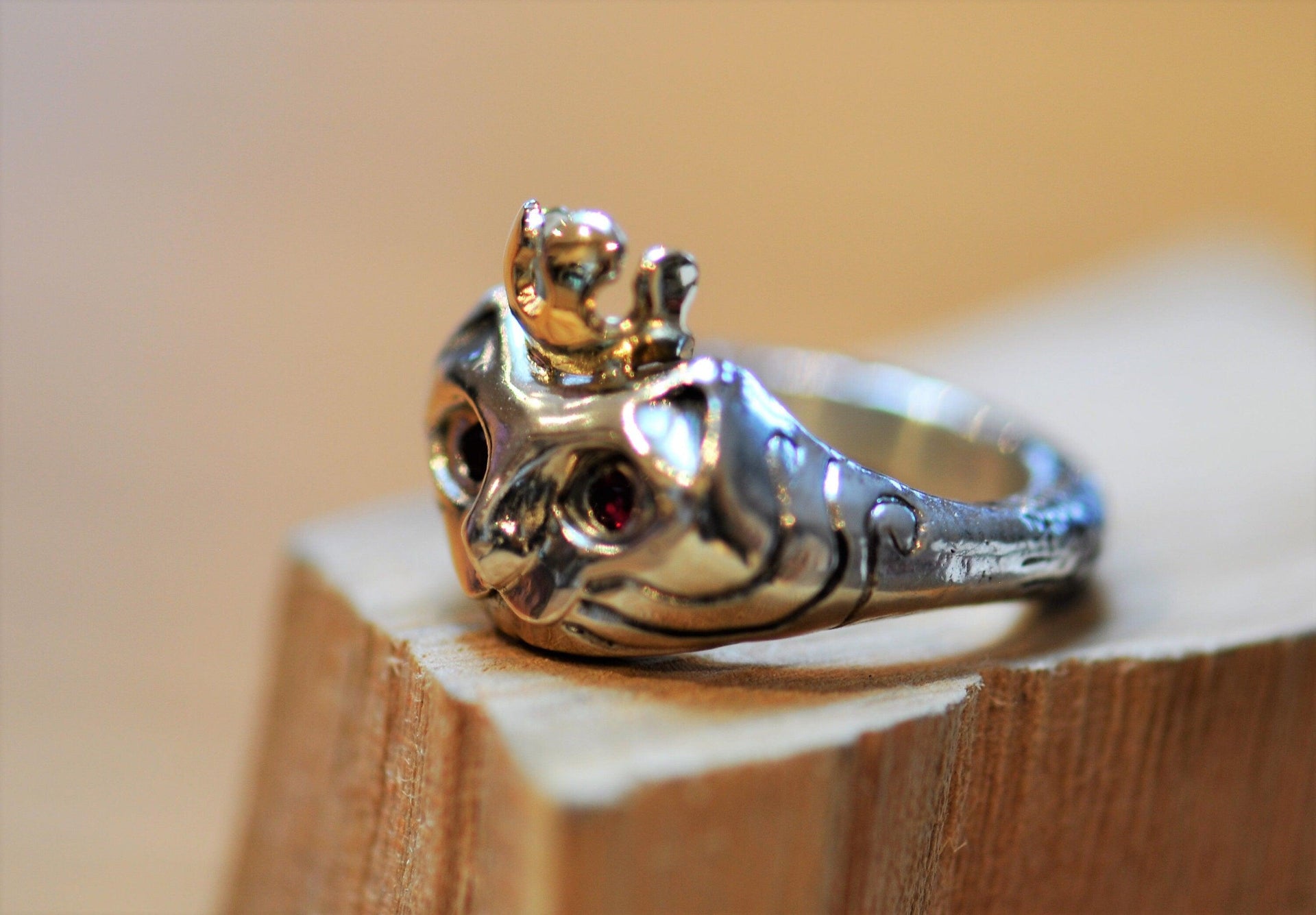 Elevate your style with our exquisite Sterling Silver Cat Ring, fit for feline royalty. Handcrafted with precision and care, this statement piece features a regal cat's head adorned with a stunning 14k gold crown. The cat's eyes are embellished with sparkling ruby gemstones, adding a mesmerizing touch to the design.